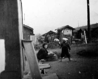 たらいで洗濯中でしょうか。場所不明。手前は台所のながしからでた樋でしょうか。 春日町 栄町2丁目17番 常盤町 千年町から見た常盤町