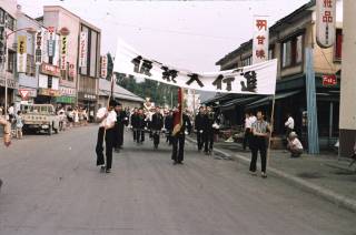 バトントワラーとブラスバンドを先頭に仮装行列がやってきます。旗のついた棒を支える男子の照れくさそうな表情がなんとも微笑ましい気がします。青春時代の途中,大夕張を後にしたものとしては,なんだか胸がしめつけらるような2枚の写真です。私が在学していた頃の鹿島中でも仮装行列をやっていました。その頃の友達や生活が思い出されます。また商店街の歩道に立って行列を見守るたくさんの人達も,あの頃のにぎやかさを思い起こしてくれます。