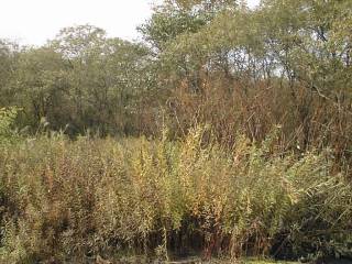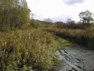 下の写真は,左の写真のちょうど向かい側にあたります。橋からまっすぐこの道を行くと鹿島中学に行くには一番の近道だったのです。かつての道の跡が確かめることができましたが,自動車の方向転換の場として使われているような感じで5,6メートル先から道路は,草原の中へ消えていました。