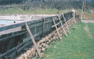 閉山後は市営プールとして使われていました。私が訪ねた時には,青いビニールシートがプールにかけられていました。周囲にはられた板はかつてと同じものでした。時間の流れとともに板は外れ,支え棒が必要になっていました。かつて私が身を乗り出そうとしていた時に邪魔だった有刺鉄線はなくなっていました。向こうに見えた栄町アパートだけでなく周囲の建物はほとんどなくなっていました。