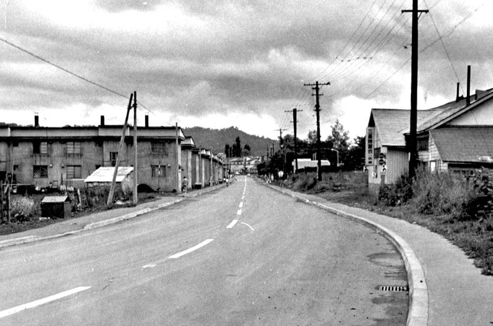 この写真の構図は私にとってはとてもなじみ深いものです。私の住んでいた富士見町から父親の勤務する炭鉱病院の方へ踏み切りを渡って右手をみるとこのように見えるのです。右手に見えるのが三菱購買会の栄町支所。小さい頃,親にお使いを頼まれるといつもここに買い物に来ていました。購買会支所のすぐ向こう側にも富士見町と栄町をつなぐ道があり,私の『お遣いの道』となっていました。夏の夜,お遣いにくると,途中の暗い街灯と,光に集まる虫,笠のついた電灯に照らされた狭い店内を思い出します。左手の栄町アパートには同級生などもたくさん住んでいました。奥には大夕張で買い物をするには,一番大きく,品物もそろっていた三菱購買会が見えています。ここが買い物の中心でした。
